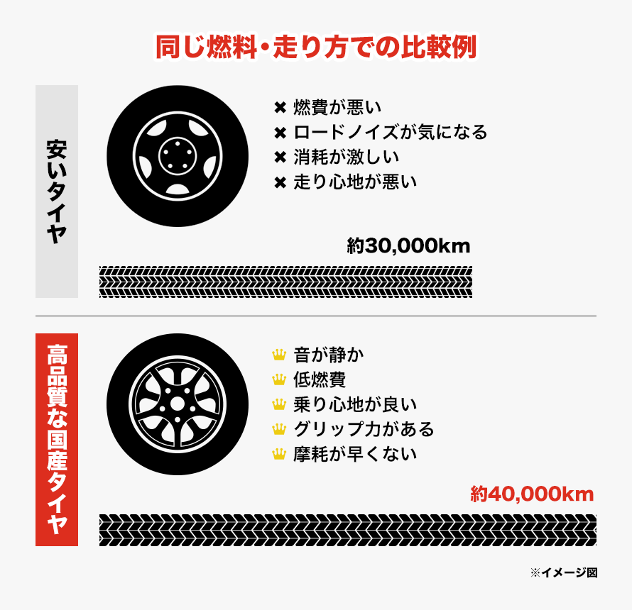 タイヤの価格を最優先にするのではなく、性能とのバランスを加味したうえで、長期的な視点で、タイヤ選びをすることをおすすめします。